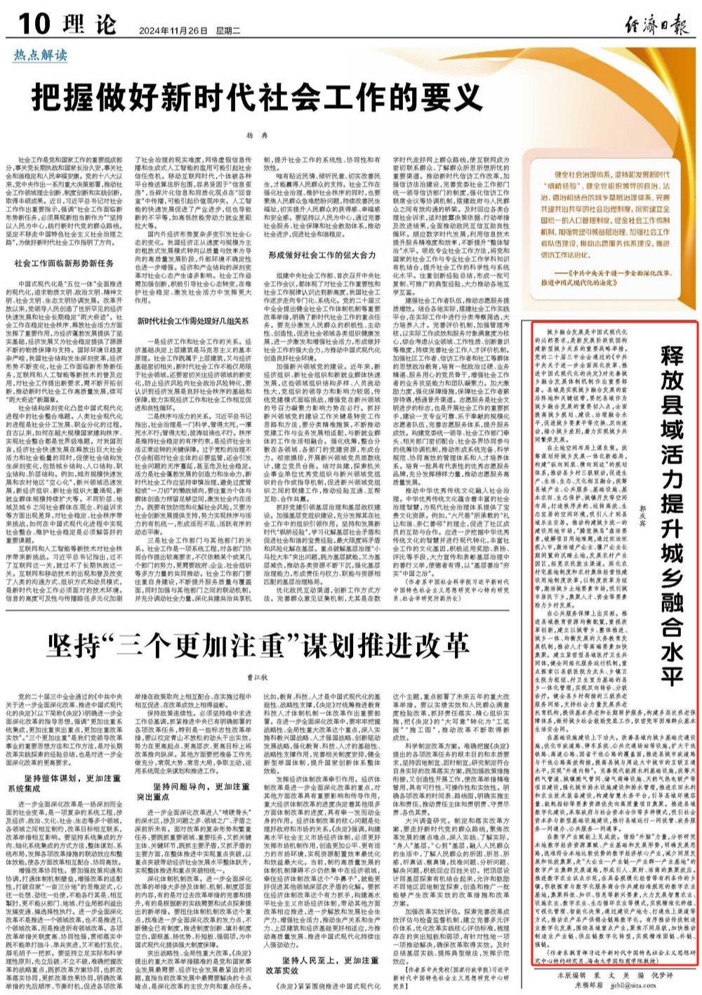 郭庆宾 教育部习近平新时代中国特色社会主义思想研究中心特约研究员、304永利集团登录入口国际商学院教授城乡融合发展是中国式现代化的必然要求,是新发展阶段我国构建新型城乡关系的重要战略举措。党的二十届三中全会通过的《中共中央关于进一步全面深化改革、推进中国式现代化的决定》对完善城乡融合发展体制机制作出重要部署。县域是实现城乡融合发展的前沿阵地和关键纽带,要把县域作为城乡融合发展的重要切入点,全面提高城乡规划、建设、...