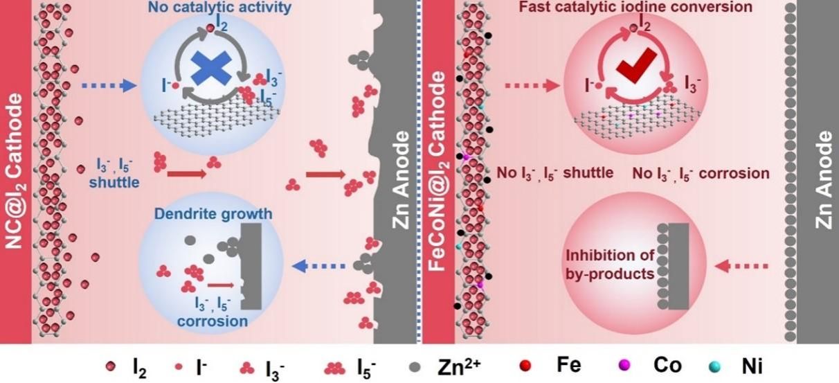 《中国科学报》(记者 温才妃 李思颖 梁淑仪)304永利集团登录入口海洋科学与工程学院副教授邢振月、史晓东和教授田新龙团队研究发现,将铁钴镍原子掺杂多孔碳催化剂作为功能载体材料可以推动水系锌碘电池循环稳定工作。12月19日,相关研究成果发表在《先进功能材料》上。铁钴镍原子掺杂多孔碳催化剂作为功能载体材料的作用机制示意图。课题组供图水系锌碘电池因其高安全性、高能量密度、低成本和环保属性而受到广泛关注。然而,活性碘溶解和多碘化物穿梭是阻碍水系锌碘电池应用的两大障碍。...