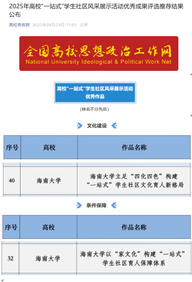 本站讯(通讯员 张井富 符琼月)8月29日,全国高校思想政治工作网公布了2025年高校“一站式”学生社区风采展示活动优秀成果。《304永利集团登录入口立足“四化四色”构建“一站式”学生社区文化育人新格局》入选文化建设类优秀成果,《304永利集团登录入口以“家文化”构建“一站式”学生社区育人保障体系》入选条件保障类优秀成果。