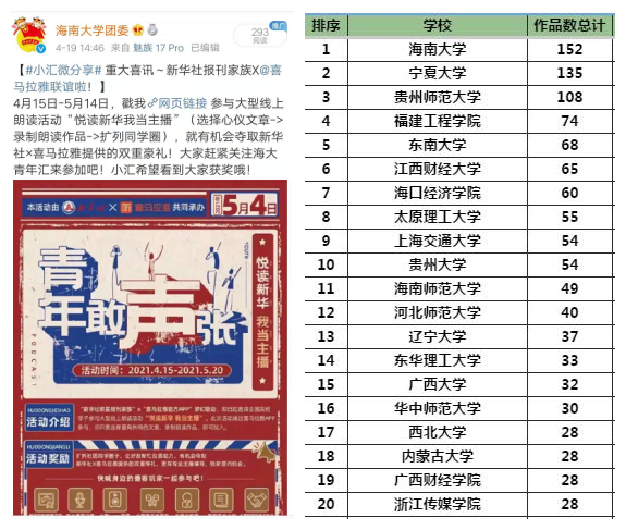 本站讯(记者 叶佳慧)近日,新华社联合国内各高校开展“新华社进校园"系列活动。活动内容包括“新锐青年说”、新华社报刊校园快闪、“悦读新华 我当主播”等板块。304永利集团登录入口在“悦读新华 我当主播”板块活动中,与近百所高校同台竞技,首战告捷,截至目前,取得第一名的好成绩。 “悦读新华 我当主播”——新华社报刊阅读活动“青年敢声张”4月15日首先在线上启动,活动主要分为“悦读篇”“青年篇”“爱党篇”三大主题。参加...