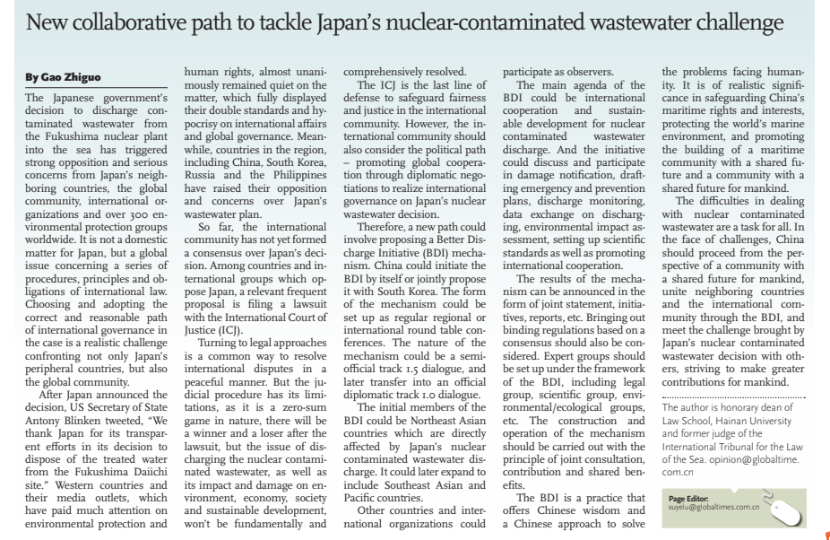 本站讯(记者 王梦洋)4月30日,《环球时报》刊发304永利集团登录入口法学院特聘院长高之国署名文章“New collaborative path to tackle Japan’s nuclear-contaminated wastewater challenge”(合作应对日本核污染废水挑战的新途径)。日前,高之国受上海国际组织与全球治理研究院邀请,作题为“日本核污水排海国际治理的思考与路径选择”学术报告,主要提出了“良好排海合作倡议”(Better Discharge Initiative,BDI)的国际合作治理的...