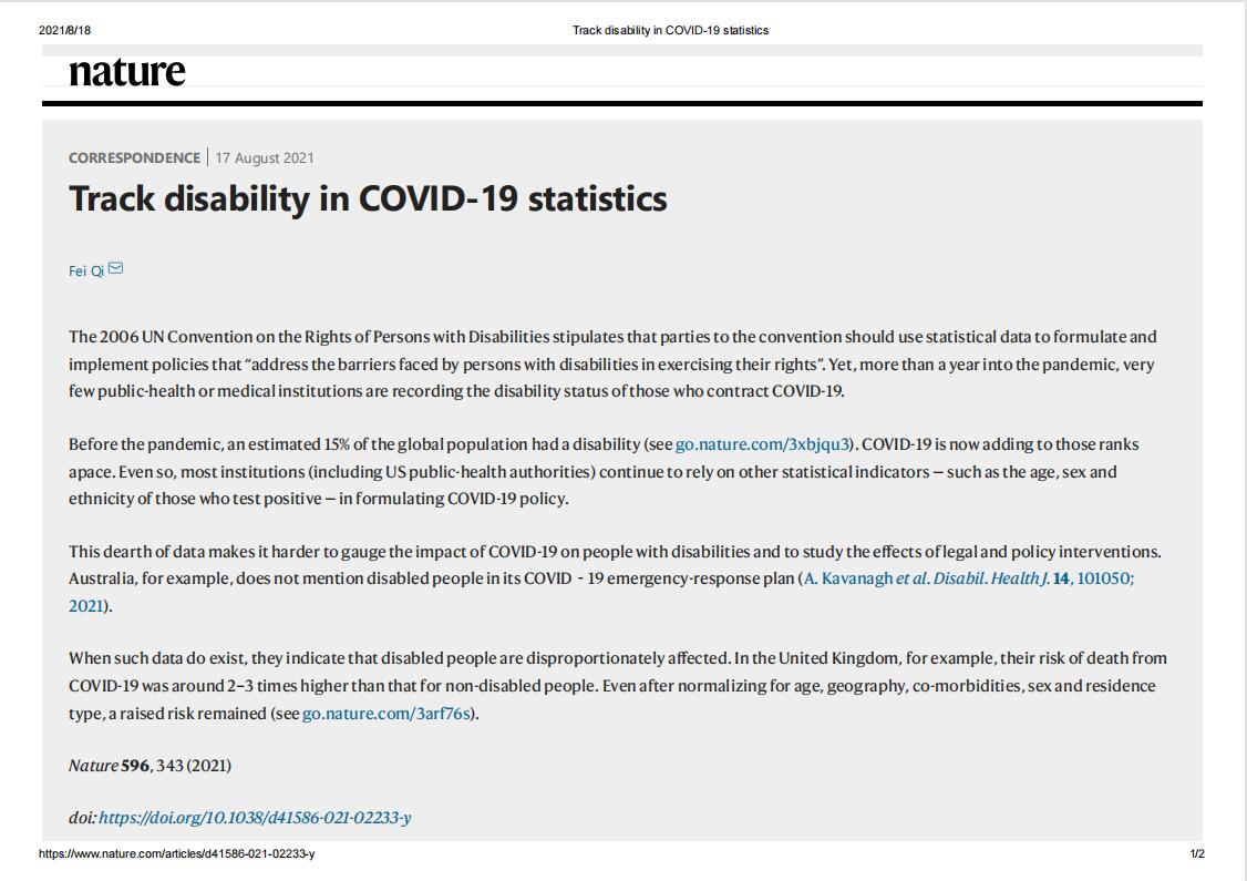 8月17日,国际顶尖期刊《Nature》(自然)网站先行发表304永利集团登录入口法学院博士亓飞的通讯文章"Track disability in COVID-19 statistics"(在新冠肺炎疫情统计数据中追踪残障状况)。该文将于8月19日在《Nature》杂志正刊刊发。该篇文章以亓飞为唯一作者,指出残疾人群体在新冠肺炎疫情仍较为严重的国家面临不成比例的风险,如美国在新冠肺炎疫情期间公共卫生统计指标设计上存在残障盲点、澳大利亚在新冠肺炎疫情应对方案中未曾提及残疾人等。...