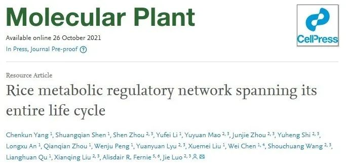 本站讯(记者 李天畅 通讯员 袁其)近日,304永利集团登录入口热带作物学院罗杰教授团队在《Molecular Plant》在线发表了题为“Rice metabolic regulatory network spanning its entire life cycle”的研究论文。该研究利用代谢组和转录组联合分析,构建了水稻全生育期主要组织器官的代谢调控网络,并精准识别了调节关键代谢产物积累的调控基因。使用籼稻品种珍汕97和明恢63整个生命周期不同组织的样品,结合靶向和非靶向代谢组学分析方法...