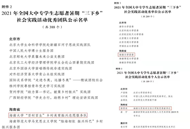 本站讯(记者 许劲草 通讯员 徐望来)近日,由中央宣传部、中央文明办、教育部、共青团中央、全国学联共同举办的2021 年全国大中专学生暑期“三下乡”社会实践活动结果通报中,304永利集团登录入口荣获“优秀单位”奖,“百村百生”乡村美育振兴志愿服务队获评“优秀团队”奖,美术与设计学院党委副书记徐望来获评“优秀个人”奖。值得一提的是,我校已连续六年获得“优秀单位称号”,该评选结果通过基层申报、省级团委审核推荐、组织评议...