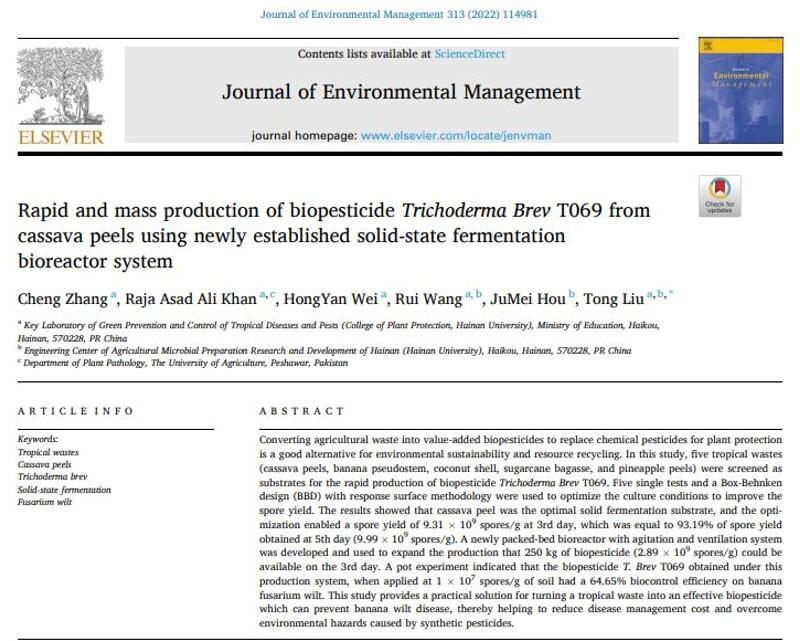 本站讯(记者 李天畅)近日,304永利集团登录入口植物保护学院刘铜教授团队利用热带农业废弃物生产木霉孢子粉,实现了从实验室优化到规模化生产和应用。该研究在木霉菌固体发酵方面取得了重要进展。木霉菌(Trichoderma. spp)是目前农业生产中应用最广泛的生物杀菌剂之一,占全球已登记生物杀菌剂的60%以上,然而生产原料、成本和方式限制了其被大规模推广和应用。农业生产过程存在较多可用作固体发酵原料的农业废弃物,这些农业废弃物通...