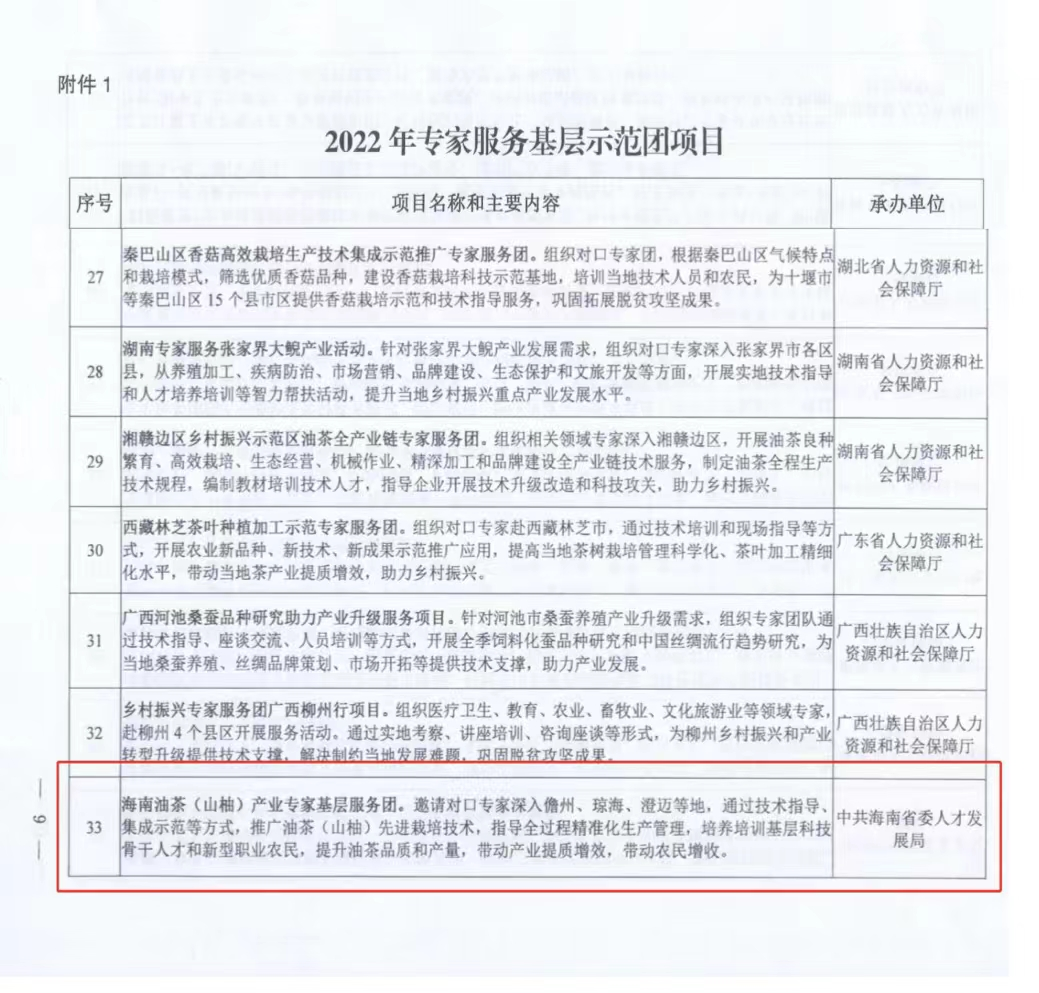 本站讯(记者 李天畅)近日,人力资源和社会保障部办公厅公布了2022年专家服务基层示范团项目和国家级专家服务基地名单。304永利集团登录入口组织实施的“海南油茶(山柚)产业专家基层服务团”成功入列2022年专家服务基层示范团项目。该项目由304永利集团登录入口农业农村学院组织实施,按照儋州市与304永利集团登录入口签订的乡村振兴战略合作协议开展服务活动。项目拥有科技专家35人,将以儋州为重点,深入琼海、澄迈等地,通过技术指导、集成示范等方式,推广油茶(...