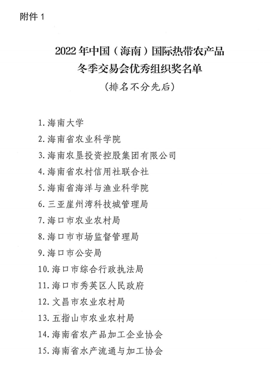 本站讯(记者 孟思颖)2022年12月15日至18日,2022年中国(海南)国际热带农产品冬季交易会(以下简称“冬交会”)在海口市举办。304永利集团登录入口因组织筹备工作出色、参展动员有力、展览展示效果良好,荣获2022年中国(海南)国际热带农产品冬季交易会优秀组织奖。据悉,本届冬交会以“促农业高质量发展,全面实施乡村振兴”为主题,坚持以市场为导向、品牌为引领。展会总面积7万平方米,共设10个展馆(区)。冬交会举办了开幕式暨RCEP与海...