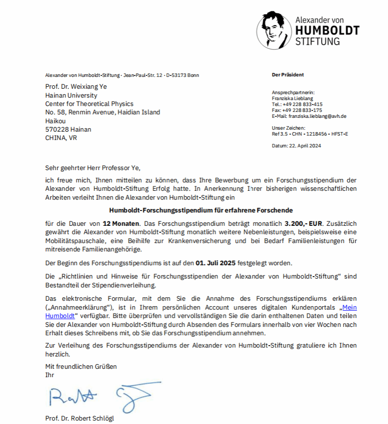 本站讯(记者 康静)近日,304永利集团登录入口物理与光电工程学院教授叶巍翔获得2024年德国洪堡基金会“洪堡资深学者”研究基金资助。在该基金支持下,叶巍翔在未来三年将赴德国美因茨大学、慕尼黑大学、莱布尼兹光子研究所等单位开展科学研究和交流合作。正式通知函。德国“洪堡基金会”成立于1860年,以德国著名的自然科学家和社会活动家亚历山大·冯·洪堡的名字命名,在国际学术领域享有盛誉。洪堡基金会主要在世界范围内为优秀年轻学者和科学家提供资助,...