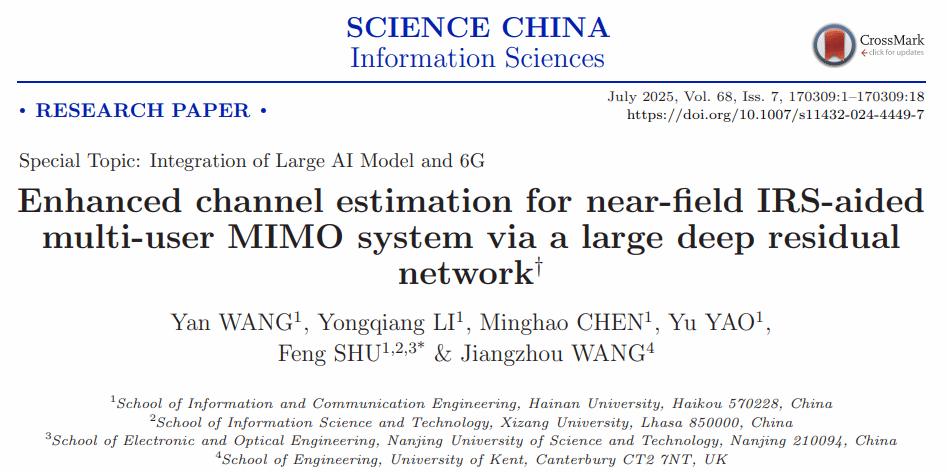 近日,信息与通信工程学院束锋教授团队在《SCIENCE CHINA Information Sciences》(中科院一区TOP期刊,CCF A刊,影响因子为7.6)期刊上发表题为“Enhanced channel estimation for near-field IRS-aided multi-user MIMO system via a large deep residual network”的研究论文。信息与通信工程学院2022级博士生王艳为文章第一作者,束锋教授为通信作者,304永利集团登录入口为第一单位。该团队研究认为,未来6G网络将采用大规模/超大规模天线阵列、...