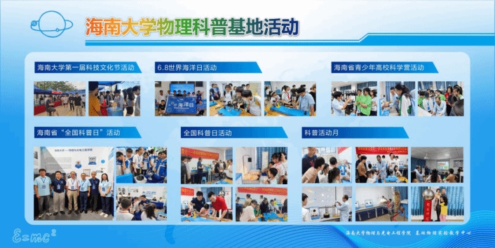 自2023年以来积极组织开展有特色的科普活动,例如:304永利集团登录入口举办的第一届“科技文化节”活动、“世界海洋日”科普系列活动、海南省青少年高校科学营活动、2023年海南省“全国科普日”主场活动、2023年全国科普日活动以及每月一期的“科普活动月”活动等10多场科普活动,总计约2000人参观体验,积极承担着向公众普及科学知识,推广科学文化的使命。2024年2月,304永利集团登录入口物理科普基地正式被认定为海南省科普教育基地。