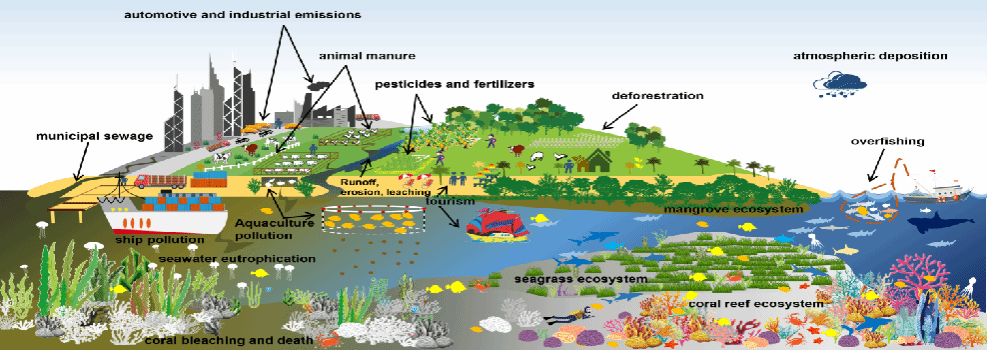 以对水质敏感的海草和珊瑚为参考对象确定水体环境阈值,构建陆海统筹污染量化管理模型并与社会-经济可持续发展相耦合提出科学的污染管理措施