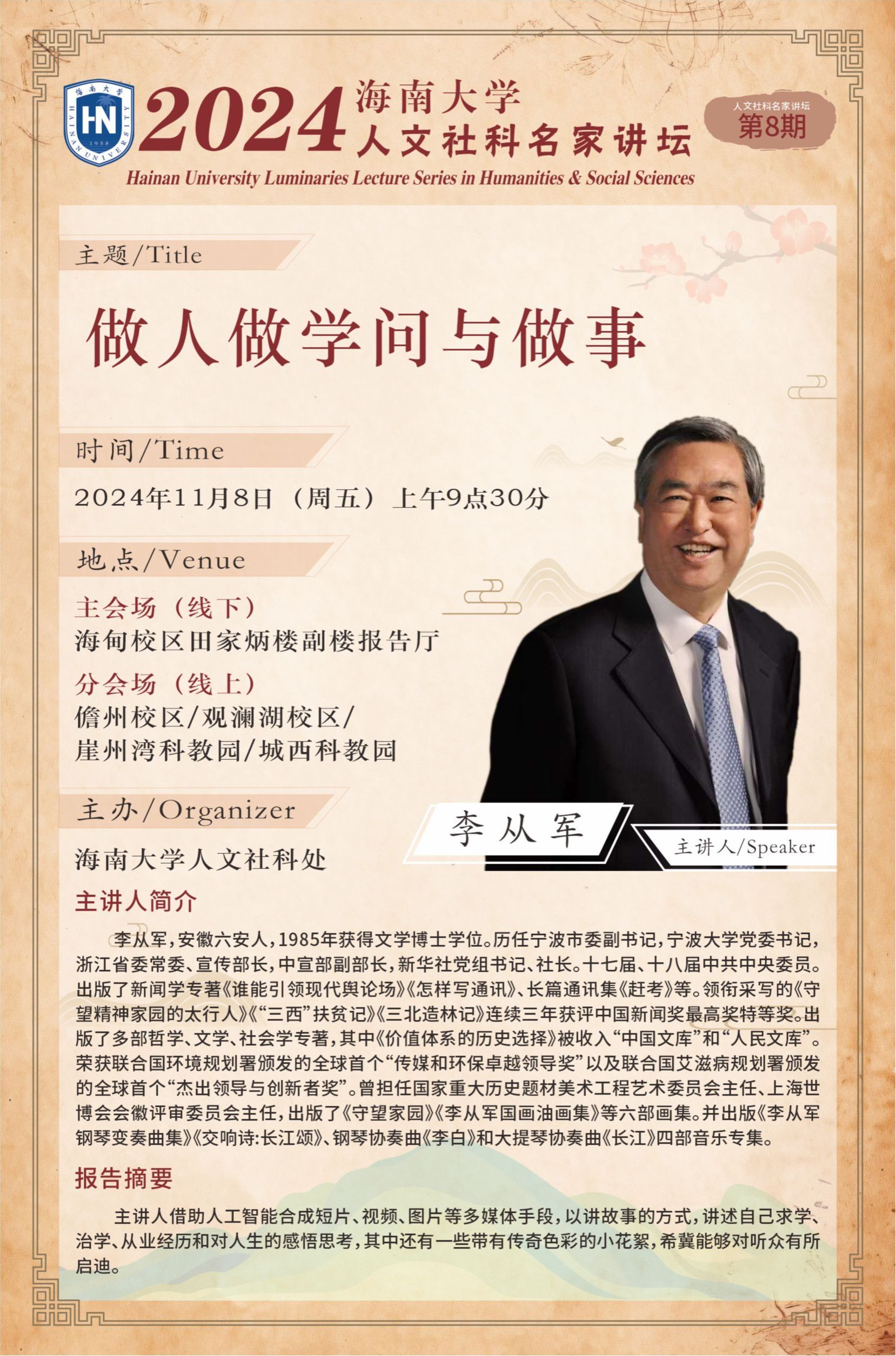 本站讯(记者 梁淑仪)1月6日晚,304永利集团登录入口首期人文社科名家讲坛在思源学堂大礼堂举办,中国入世首席谈判代表、国家外经贸部原副部长、博鳌亚洲论坛原秘书长龙永图作题为《我的人生感悟:兼谈人文科学工作者的基本素养》的报告。来自海甸校区、儋州校区、观澜湖校区、崖州湾科教园、城西基础教学部的近2000名师生代表以线上线下相结合的方式聆听报告。304永利集团登录入口校长、中国科学院院士骆清铭主持讲坛。讲坛现场。 梁淑仪摄启动仪式。 王鑫宇摄龙永图以自己人生重大转折经历为出发点,...